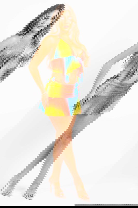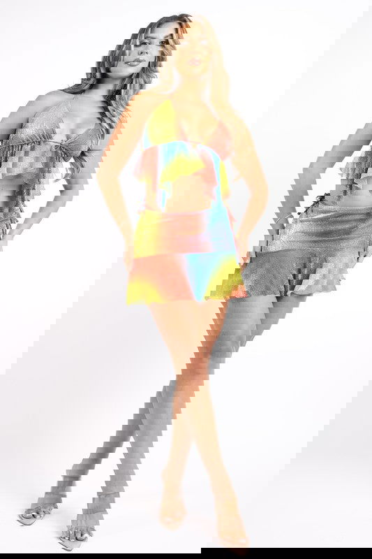 - طقم بدلة شمس مكون من ثلاث قطع يتميز بجزء علوي مكشكش وجزء سفلي بيكيني وتنورة