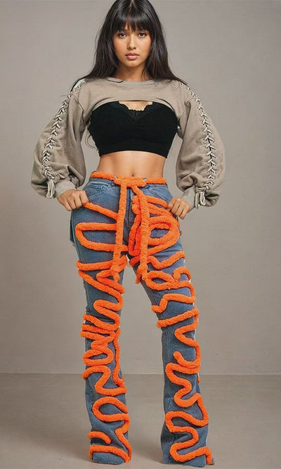Unleash your bold style with these eye-catching denim pants, a true statement piece for those who dare to stand out. Featuring a classic blue denim base, these pants are taken to the next level with vibrant orange piping that swirls around the legs in an organic, snaking pattern. The design not only adds a splash of color but also creates a sense of movement and an illusion of texture. The high waist cut ensures a flattering fit, while the slim silhouette tapers down to the ankles, highlighting the contours of your figure. Perfect for making a statement at casual outings or edgy enough for a night out, these pants are a versatile addition to any fashion-forward wardrobe. Pair with a simple top to let the pants shine or go bold with an equally daring piece for a full-on impactful ensemble.